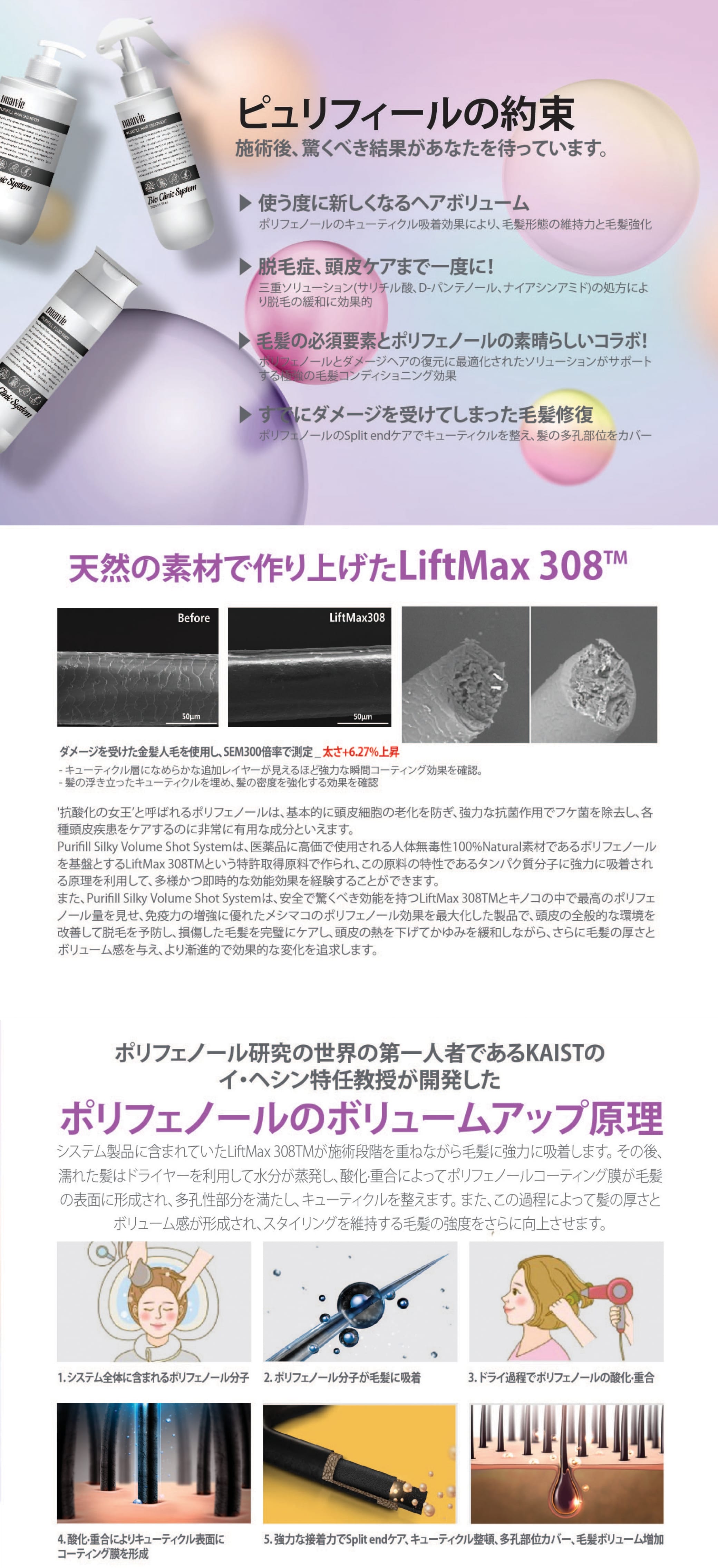 ハリコシだけではなく髪の質感にもアプローチし、360度イキイキと健康的な髪を実現します。また、髪に優しく様々な髪質にフィット、ダメージ防止へも導きます。